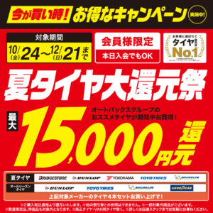 夏タイヤ大還元祭【10/24~12/21】 オートバックス会員限定、夏タイヤ大還元祭を10月24日(金)~12月21日(日)まで実施いたします。 オートバックス会員様[入会金・年会費無料/当日入会可] 対象の夏タイヤ4本セ...