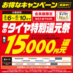 春の夏タイヤ大還元祭【3/6~5/10】 オートバックス会員様限定、春の夏タイヤ大還元祭を3月6日(金)~5月10日(日)まで実施いたします。 オートバックス会員様[入会金・年会費無料/当日入会可] 対象の夏タイヤ4本セ...