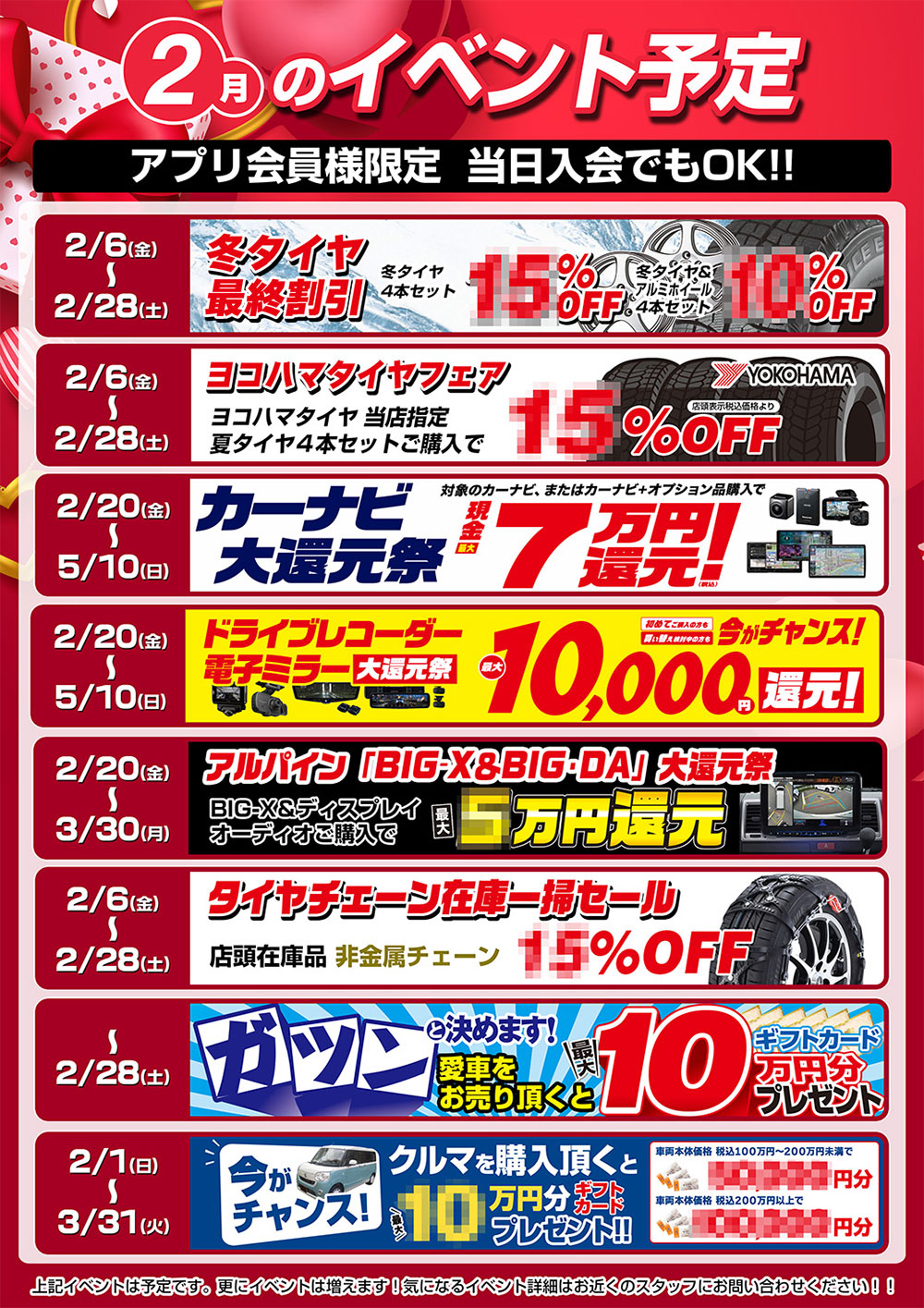2月のイベント情報 2026年2月3日 🍫 2月のイベント情報です! 🍫 イベント・キャンペーン記事一覧に戻る 最近の投稿 春の夏タイヤ大還元祭【3/6~5/10】 ドラレコ最大1万円大還元祭【2/20~5/10】 カーナビ最大7万円大還元祭!【2/20~5/10】 2月のイベント情報 1月のイベント情報 アーカイブ 月別アーカイブ 2026年3月 [1] 2026年2月 [3] 2026年1月 [1] 2025年12月 [3] 2025年10月 [4] 2025年9月 [1] 2025年8月 [1] 2025年7月 [2] 2025年6月 [4] 2025年5月 [3] キーワード検索 検索 Tag Cloud #キーパーコーティング #洗車 #梅雨 #雨 #オートバックス #カー用品 ETCETC2.0アウトドアエアコンフィルターオートバックスオートバックス ブリヂストン ヨコハマタイヤ ダンロップ パイオニア パナソニック ケンウッド アルパイン 暑い 夏 快適ドライブレコーダー助成キャンペーン